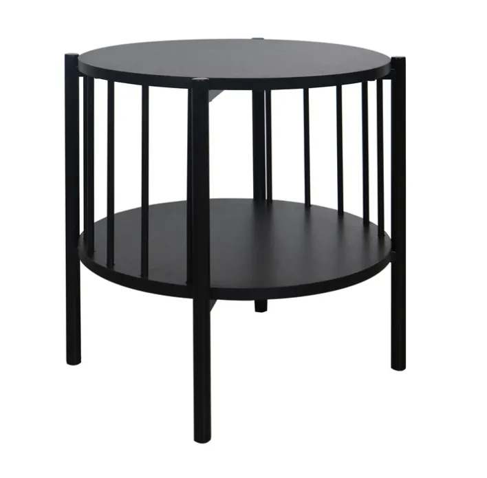 Dieser runde Beistelltisch präsentiert sich mit einer klaren, modernen Formensprache und ist ganz in mattem Schwarz gehalten. Die Oberfläche zeigt eine gleichmäßige, pulverbeschichtete Optik ohne sichtbare Maserung. Das Gestell besteht aus vier schlanken Stahlfüßen, die durch vertikale Streben miteinander verbunden sind und für Stabilität sorgen.