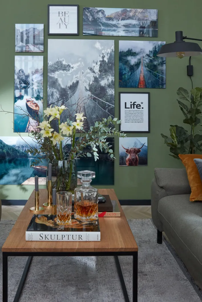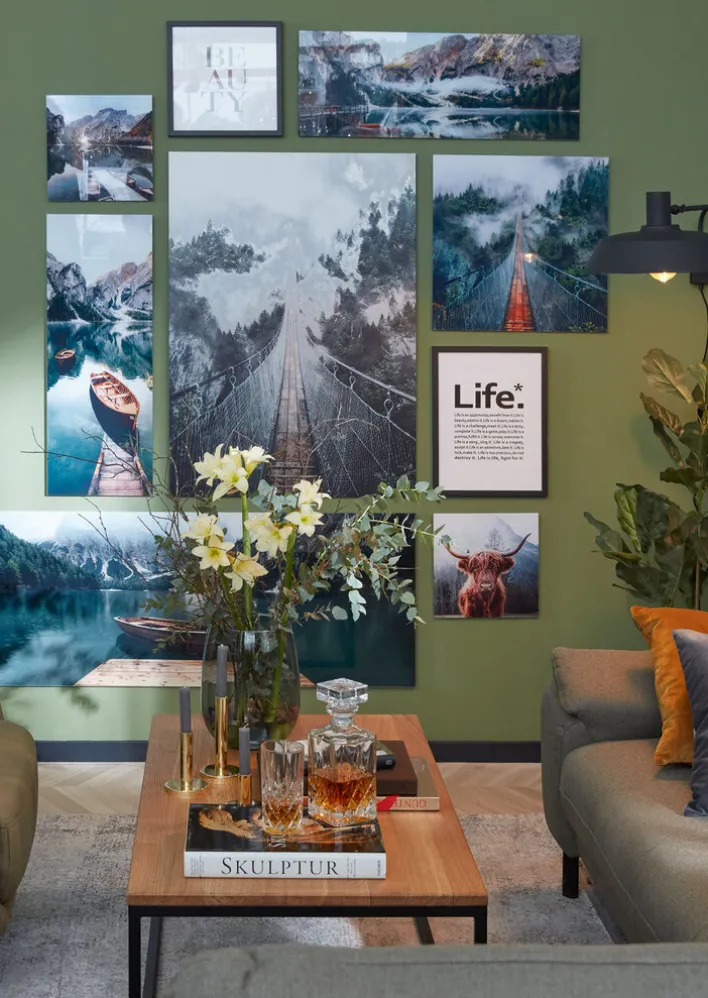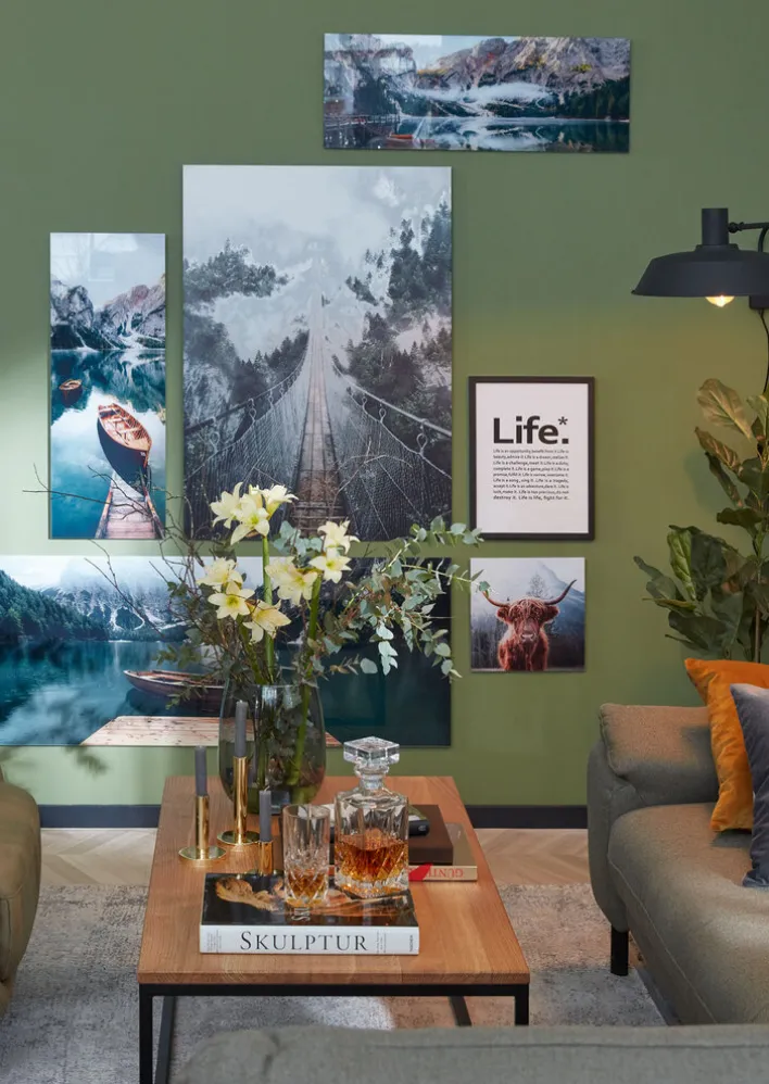 Im Mittelpunkt dieses Bildes steht ein Schottisches Hochlandrind, das direkt in die Kamera blickt. Sein kuscheliges Fell ist in einem warmen Braunton gehalten. Im Hintergrund lässt sich eine Berglandschaft mit jeder Menge Bäumen erahnen. Das Farbkonzept ist natürlich und ruhig gewählt, sodass sich das Bild positiv auf die Raumatmosphäre auswirkt. Außerdem passt es dank der Farbwahl zu diversen Einrichtungsstilen. Es wurde auf hochwertiges Floatglas gedruckt und hat ein Gewicht von 0,98 kg.