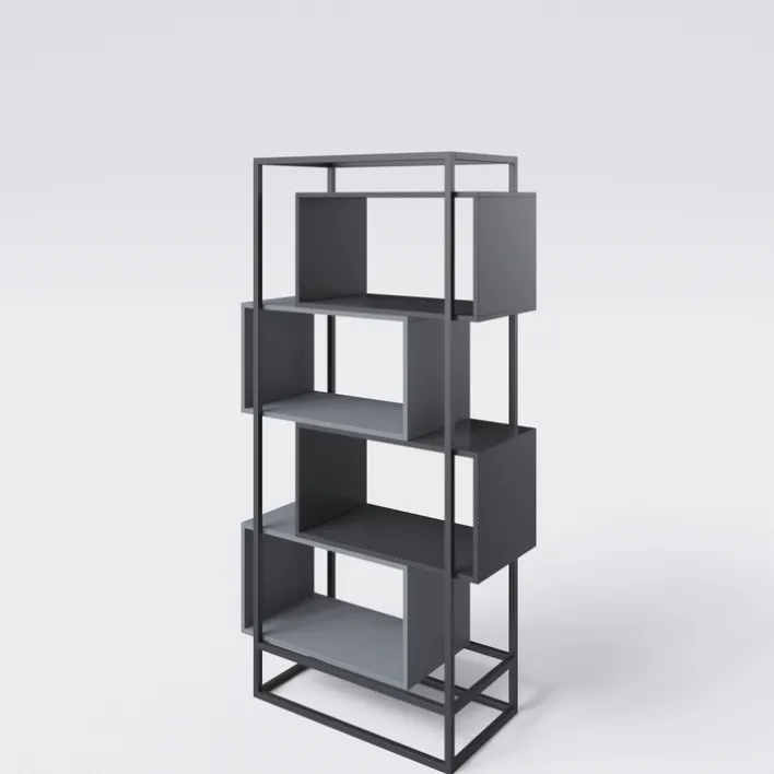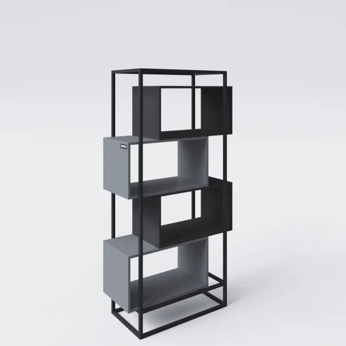 Insgesamt verfügt das Bücherregal der Marke MINECRAFT über vier offene Fächer, die seitlich versetzt sind und sich zugleich farblich unterscheiden. Der Hersteller setzt abwechselnd auf graue und schwarze Fächer, in Kombination mit dem schwarzen Metallrahmen entsteht eine eindrucksvolle Gesamtoptik. Mit einer Höhe von 163,5 cm und einer Breite von 87 cm bietet dieses Regal viel Raum, um Bücher attraktiv in Szene zu setzen. Das Bücherregal ist weit mehr als bloßer Stauraum, es dient der gezielten Präsentation schöner Bücher wie Bildbände und hochwertiger Hardcover-Ausgaben.