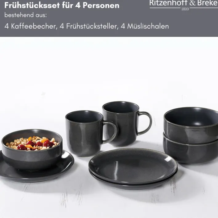 Das 12-teilige Frühstücksservice TOLEDO von Ritzenhoff & Breker ist aus hochwertigem Steinzeug in der Farbe Grau gefertigt. Es ist spülmaschinenfest und mikrowellengeeignet.