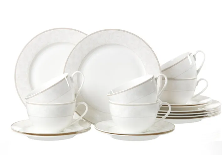 Zarte, elfenbeinfarbene Ornamente verschönern diese festliche, cremeweiße Kaffeeservice ISABELLA und erscheinen als leichter 3D-Effekt. ISABELLA ist das perfekte Geschirr für besonders festliche Gelegenheiten wie Konfirmation, Kommunion, Hochzeit oder Weihnachten. Das komplette Kaffeeset ist aus hochwertigem Fine-China-Porzellan gefertigt und besteht aus jeweils sechs Kaffeetassen, Untertassen und Dessertteller. Natürlich ist das Kaffeeservice ISABELLA auch spülmaschinengeeignet