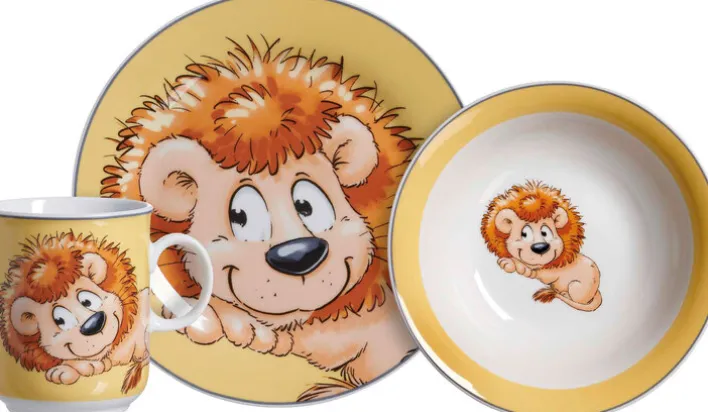 Ein fröhlicher Löwe präsentiert sich mal komplett, mal nur mit Kopf und Mähne auf den Geschirrteilen. Die Hautfarbe und die orangefarbene Mähne sind teilweise auf gelben Grund zu sehen, teilweise ist dieses Gelb als Rand gearbeitet. Löwen begeistern alle Kinder und dieser ist ausgesprochen handzahm. Es gibt also nichts zu befürchten und der Nachwuchs hat beim Essen sicher seine helle Freude an dem sympathischen Tier.