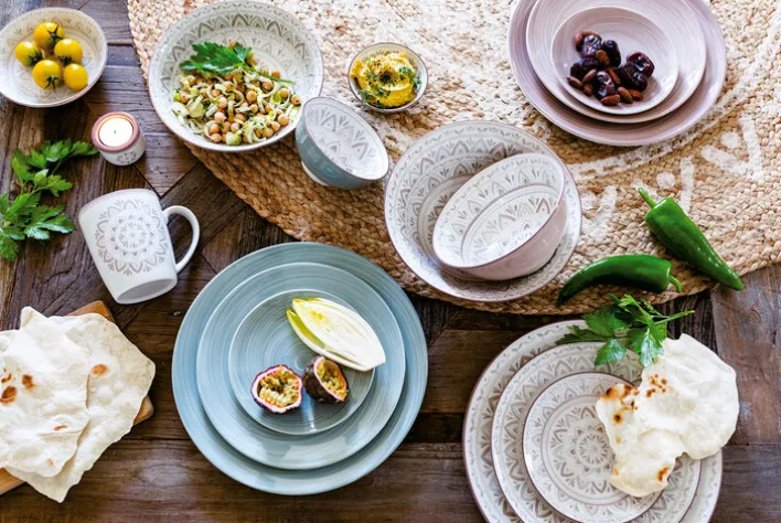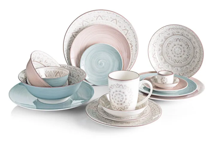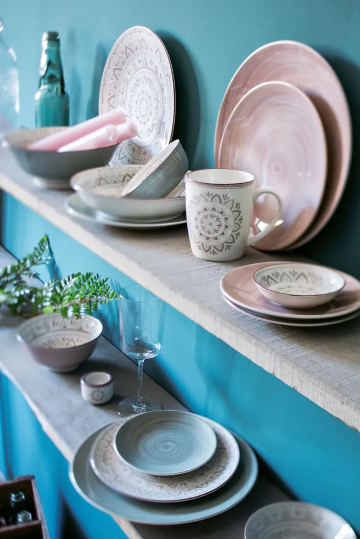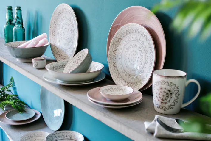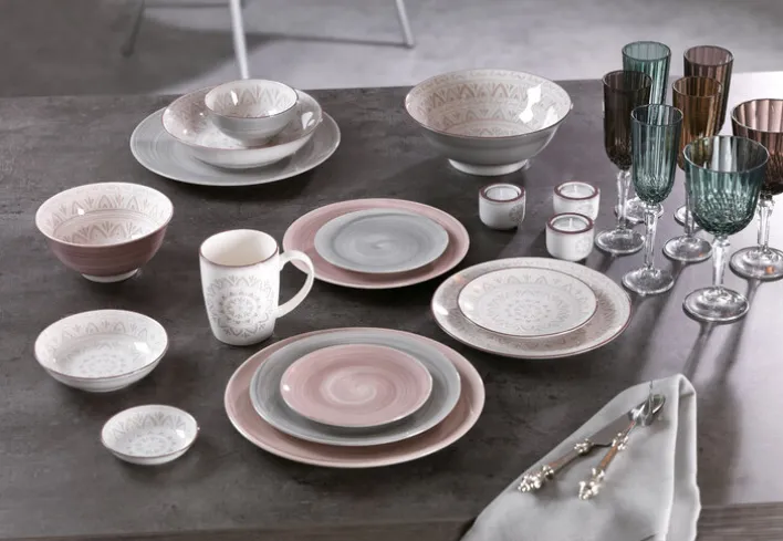 Die kunstvolle konzentrische Ornamentik von „Valencia“ erinnert an die berauschend opulenten Motive andalusischer Mosaikfliesen. Prächtig gemusterte Fliesen gelangten während der Vorherrschaft der Mauren aus dem Orient nach Südspanien und schmücken dort auch heute noch Wände und Böden unzähliger Gebäude. Anders als ihre farbkräftigen Vorbilder präsentieren sich die „Valencia“-Dessins in samtig-dezenten Erdtönen. Dadurch, dass diese in Stempeltechnik aufgebracht werden, sind kleine Unterschiede in punkto Farbintensität und/oder Dekor-Ausprägung unvermeidlich, d.h. kein Teil gleicht exakt dem anderen, sondern jedes ist gewissermaßen ein Unikat.