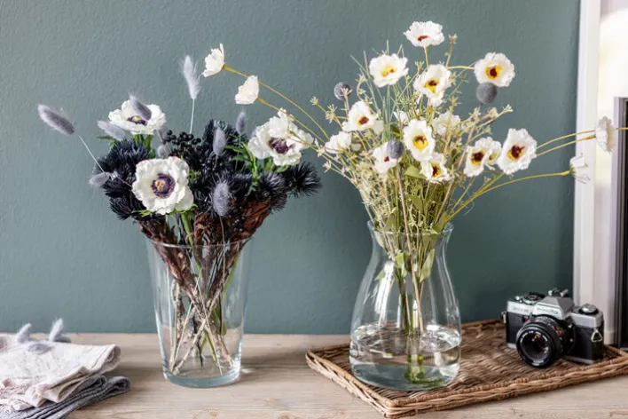 In der transparenten Vase DIANA lassen sich Sträucher und Schnittblumen geschmackvoll in Szene setzen. Sie findet auf Fensterbänken, Küchentischen oder Kommoden Platz. Neben seiner Funktion als Blumenvase eignet sich das Gefäß als dekoratives Element: Die Vase lässt sich mit saisonalem Zimmerschmuck wie Weihnachtskugeln oder Lichterketten kombinieren. Das Arrangement mit anderen Produkten aus der Serie wirkt besonders stilvoll.