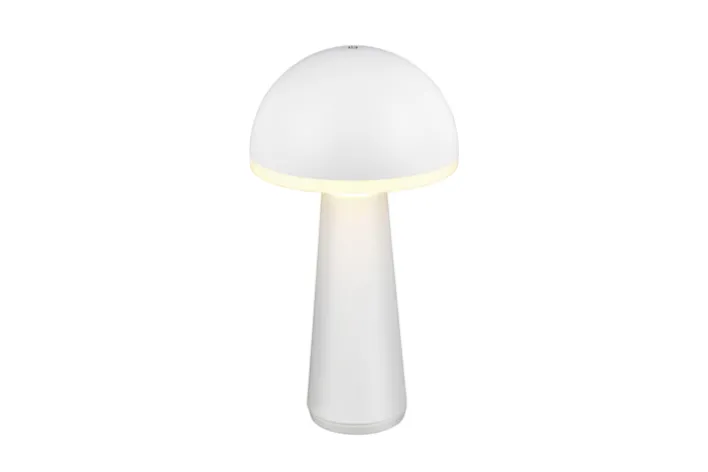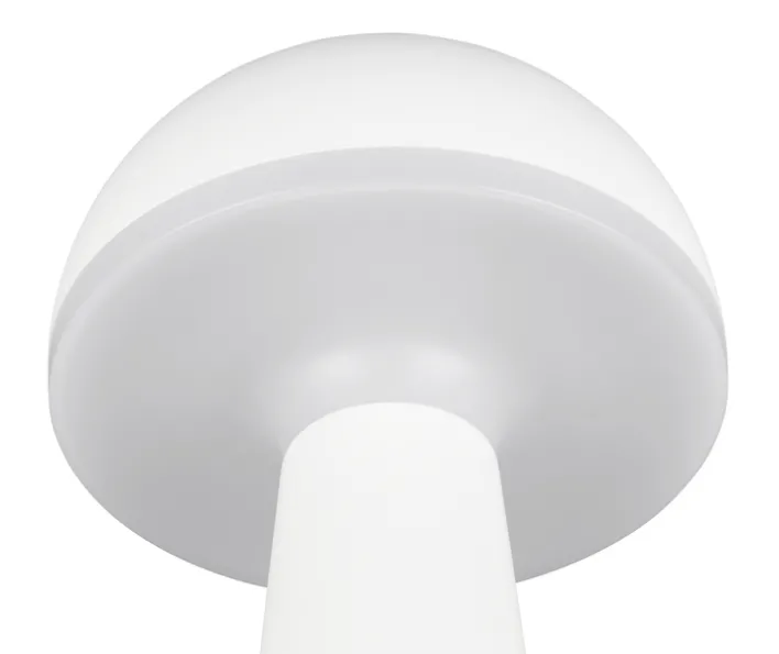 Die weißfarbige Tischlampe FUNGO mit Akku und LED ist aus Aluminium gefertigt. Besonders praktisch an ihr: Sie verfügt über eine separate Ladestation und ist damit noch flexibler einsetzbar.