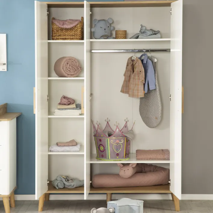 Der Kinder-Drehtürenschrank aus der Serie PAULINE bietet eine moderne und funktionale Lösung für das Kinderzimmer. Mit einer Breite von 135 cm, einer Höhe von 200 cm und einer Tiefe von 55 cm bietet er großzügigen Stauraum. Der Schrank ist in einem eleganten Weiß gehalten, das durch Akzente in Artisan Eiche ergänzt wird. Diese Kombination verleiht dem Möbelstück eine zeitlose und ansprechende Optik, die sich harmonisch in verschiedene Einrichtungsstile einfügt.