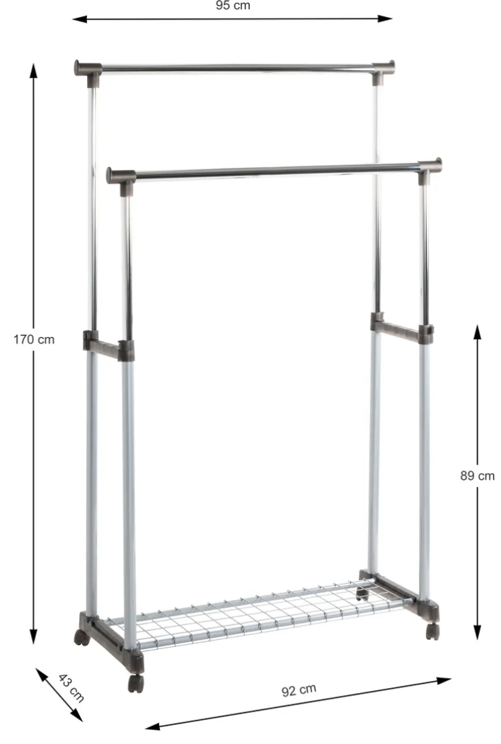 Die praktische Rollgarderobe mit den Maßen 95 x 95-170 x 43 cm ist aus Metall in der Farbe Chrom. Sie schafft Platz und Ordnung in Schlaf- und Ankleidezimmern. Zur Ausstattung der vielseitig verwendbaren Garderobe zählen zwei verstellbare Kleiderstangen für Hemden, Hosen, und Jacken. Die Ablage bietet zusätzlichen Stauraum für mehrere Paar Schuhe.