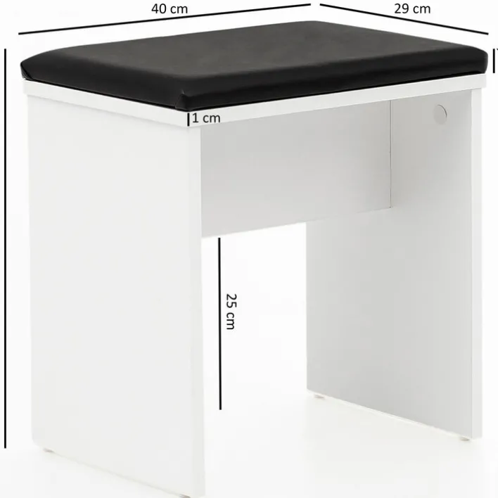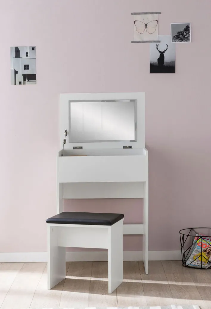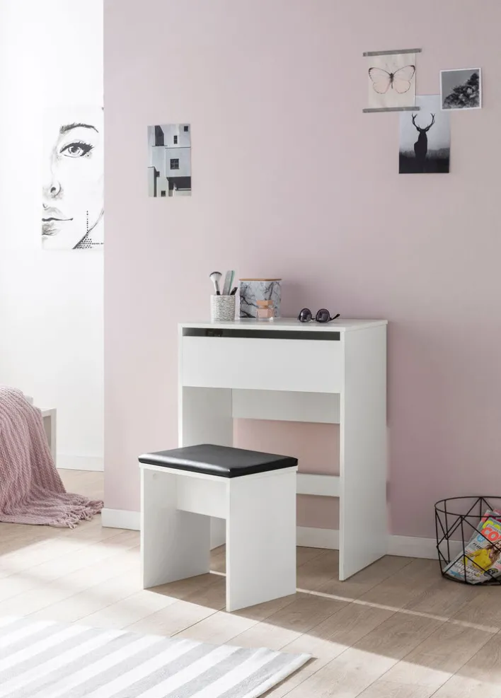 Der Schminktisch findet aufgrund seiner geringen Größe in jeder Wohnung Platz. Am besten stellt man ihn im Schlafzimmer auf. Auch für Teenager hat er Vorteile, weshalb er ebenso eine gute Wahl für das Jugendzimmer darstellen könnte. Der mitgelieferte Hocker, der optisch perfekt zum Tisch passt, ist leicht gepolstert. Der Spiegel befindet sich auf der Innenseite der Klappe, unter der sich ein Fach für Make-up versteckt.