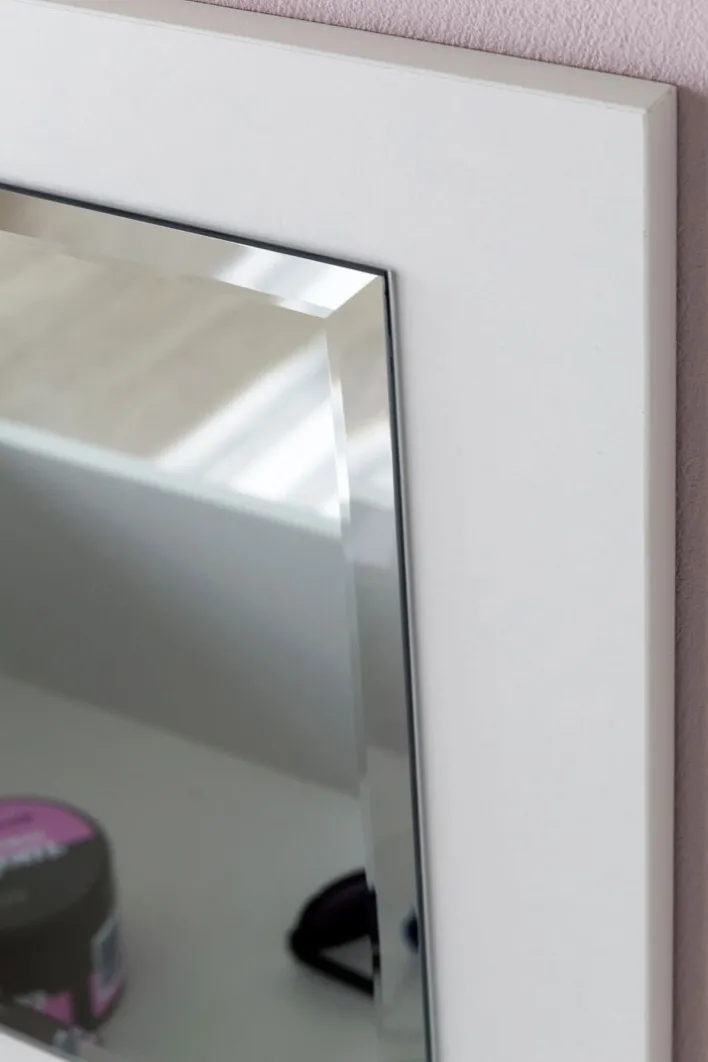 Der weiße Schminktisch hat die Abmessungen 60 x 81 cm. Der Hocker und der Spiegel sind bereits im Lieferumfang enthalten. Wird der integrierte Spiegel nicht gebraucht, lässt er sich einfach einklappen.