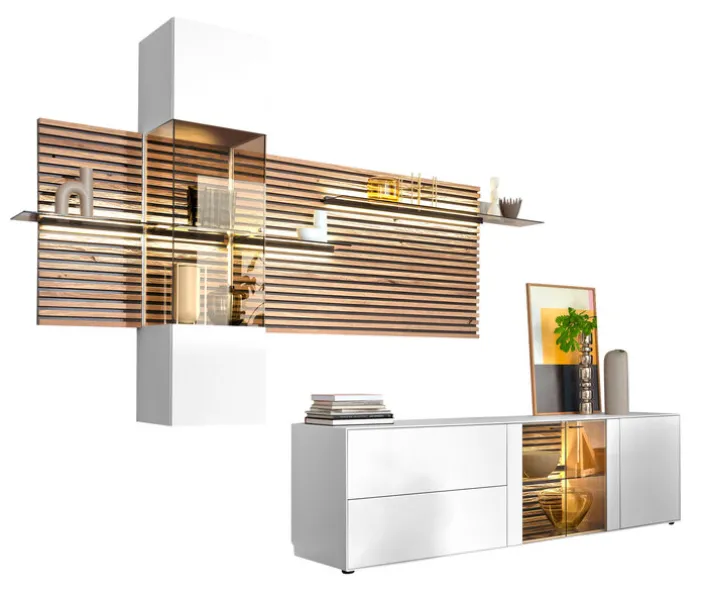 Die SCHÖNER WOHNEN-Kollektion Wohnwand YONNA mit Glasboden ist ein top moderner Eyecatcher für das Wohnzimmer, der viel Platz für Dekorationen und Alltagsgegenstände bietet.