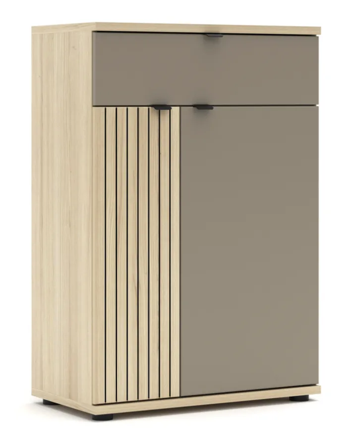 Der Schrank verfügt über zwei Drehtüren und eine Schublade, die zusätzlichen Stauraum bieten. Die Soft-Close-Funktion sorgt für ein sanftes und leises Schließen der Türen. Die mattierte Oberfläche und die dekorative Eichenoptik an der linken Tür verleihen dem Schrank eine besondere Note.