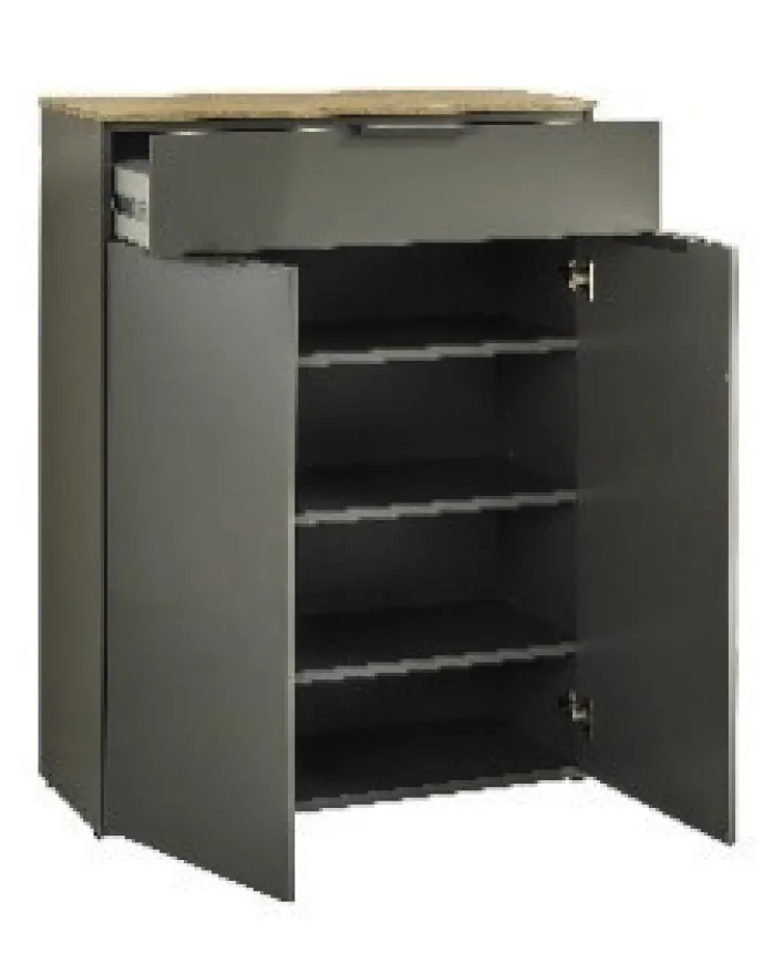 Drei Einlegeböden, zwei Türen und ein Schubkasten: So kann man den coolen Schuhschrank GALAVERNA zusammenfassen. Doch das Modell hat noch mehr zu bieten: Im Flur neben der Wohnungs- oder Haustür aufgestellt beweist er mit seiner attraktiven Farbe guten Geschmack. Sein grauer Korpus ist 35 cm tief und mit einer Abdeckplatte im Stil von Artisan-Eiche bedeckt, die dekoriert werden kann. Die Griffe bestehen aus Metall.