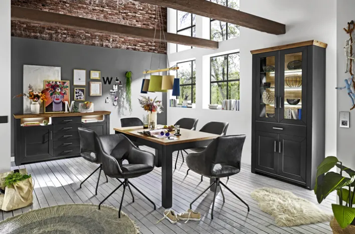 Ein modernes Ambiente und jede Menge Platz für das Lieblingsporzellan erhalten Wohn- und Esszimmer mit der set one by Musterring Vitrine YORK 01 in Anthrazit/ Eiche Artisan.