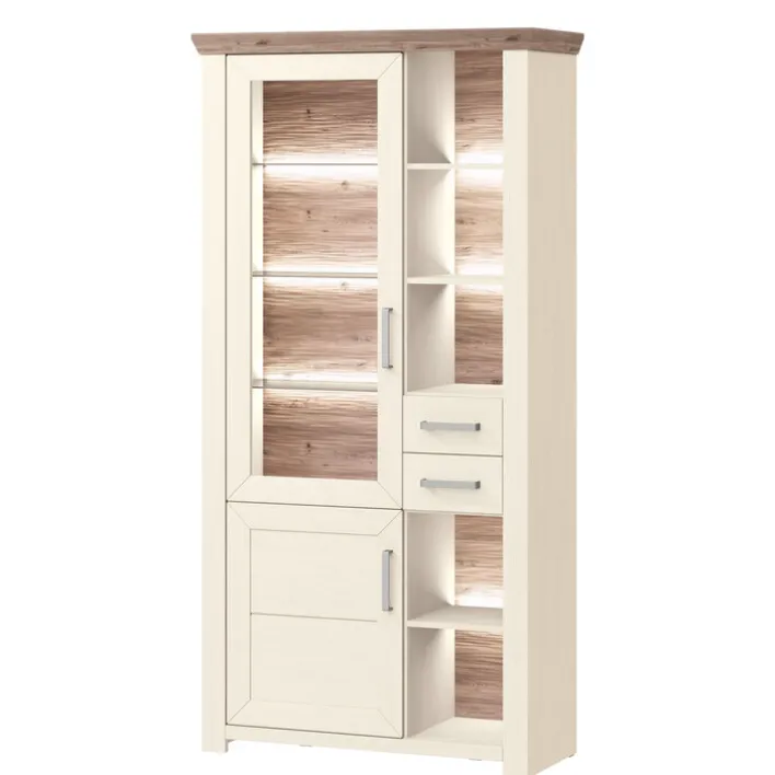 Die Vitrine YORK verbindet traditionelles Design mit zeitgemäßer Funktionalität. Die Oberflächen des Hochschrankes sind in Pino Aurelio Nachbildung gestaltet. Die von vorn sichtbare Rückwand der