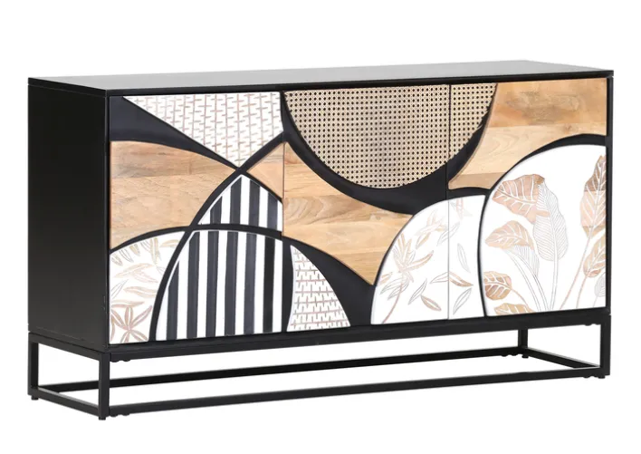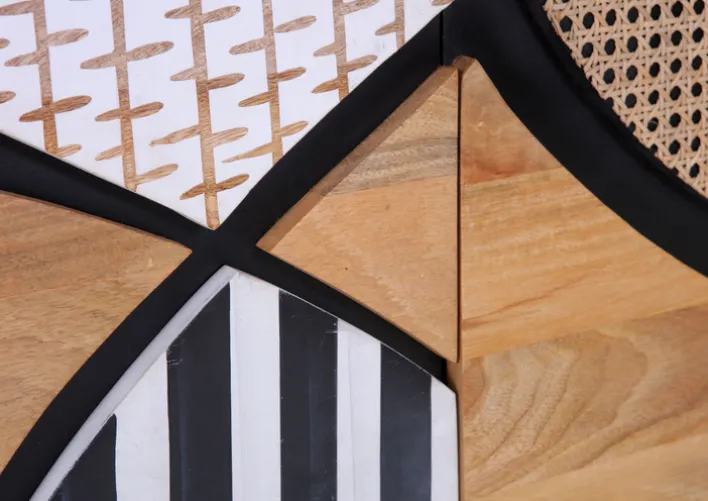 Die Gestaltung integriert Elemente aus Wiener Geflecht, naturbelassenes Mango-Massivholz sowie weiß und schwarz lackierte Flächen mit Streifen- und Blattmotiven. Die Fronten sind in geometrischen Mustern angeordnet, wodurch ein abwechslungsreiches und lebendiges Erscheinungsbild entsteht. Das Gestell aus pulverbeschichtetem Metall sorgt für Stabilität und unterstreicht die moderne Optik.