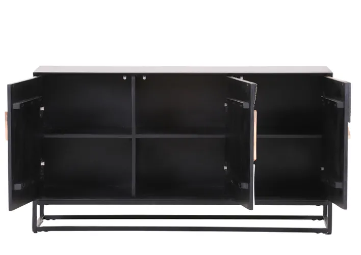Der Korpus besteht aus massivem Mangoholz, das schwarz gebeizt und lackiert ist, während die Fronten verschiedene natürliche und grafische Elemente aufweisen.