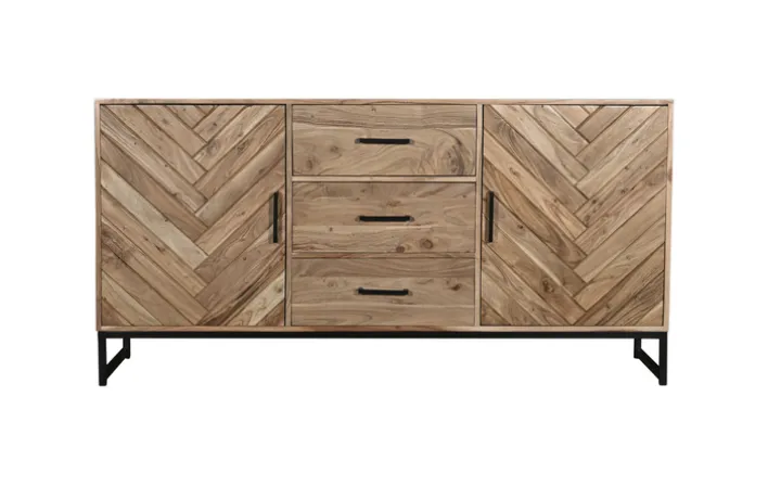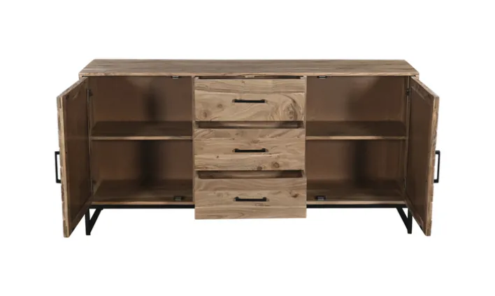 Das 160 x 80 cm große LUANDA Sideboard aus Akazie in Natur/Schwarz ist ein ebenso massives wie flexibel in den Raum integrierbares Möbelstück, das mit seiner auffälligen und für die Akazie charakteristischen Maserung an der Vorderseite sofort die Blicke auf sich zu ziehen weiß. Ebenfalls ein Highlight: Die unterschiedliche Holzverarbeitung an den Seiten gegenüber den Schubkästen in der Mitte.