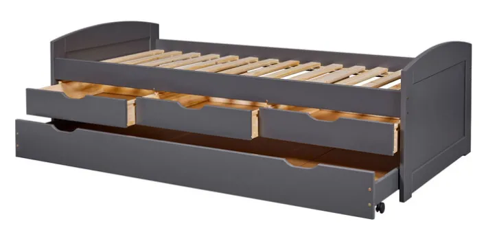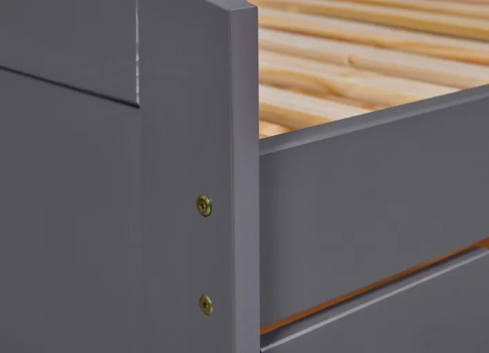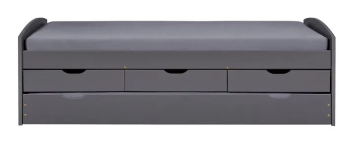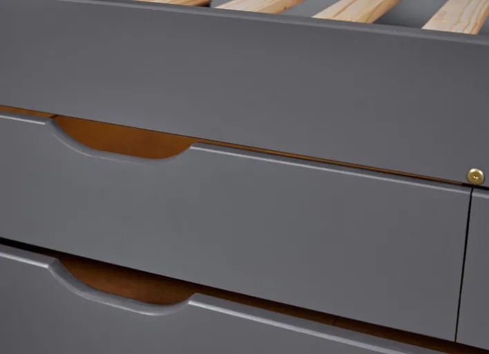 Das Stauraumbett ANDRE wird aus grau lackierter massiver Kiefer hergestellt. Ein bis 100 kg belastbarer Lattenrost ist im Lieferumfang inbegriffen. Darunter befinden sich drei gleich große Schubladen sowie ein großer Schubkasten, der als zusätzliches Staufach genutzt werden kann. Alternativ kann eine Matratze in diesem untergebracht werden, sodass im Handumdrehen eine Gästeliege zu Verfügung steht.