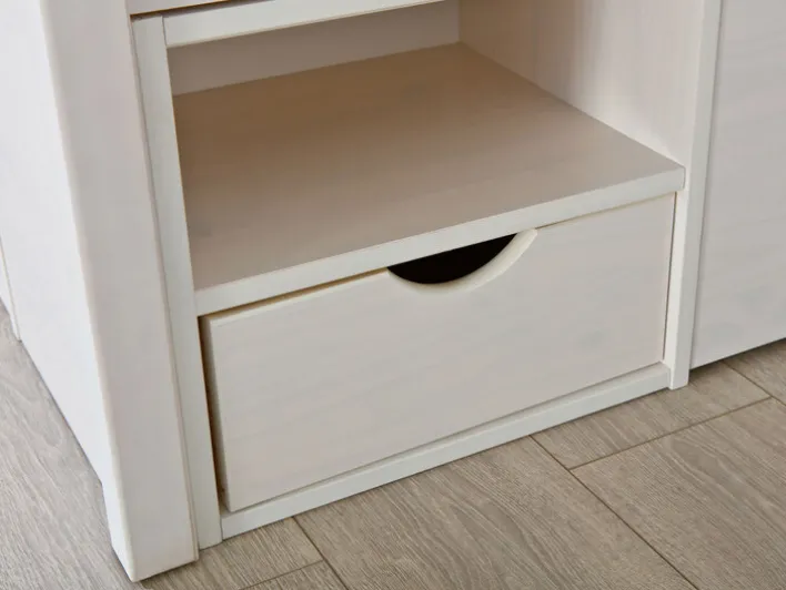 Das Stauraum-/Funktionsbett LAURO benötigt eine Stellfläche von 146 x 47,5 x 199 cm. Es besteht aus weiß lackiertem, massivem Kiefernholz und lässt sich dank solider Bauweise mit bis zu 200 kg belasten. Das Highlight des Bettes ist jedoch da Stauraum-Gestell. Dieses wartete mit Schubkästen und offenen Fächern auf und sorgt so ohne weiteren Platzbedarf für zusätzlichen Stauraum. Darüber hinaus kommen mit dem Bett zwei passende Lattenroste sowie zwei Nachtkästen in das Schlafzimmer.