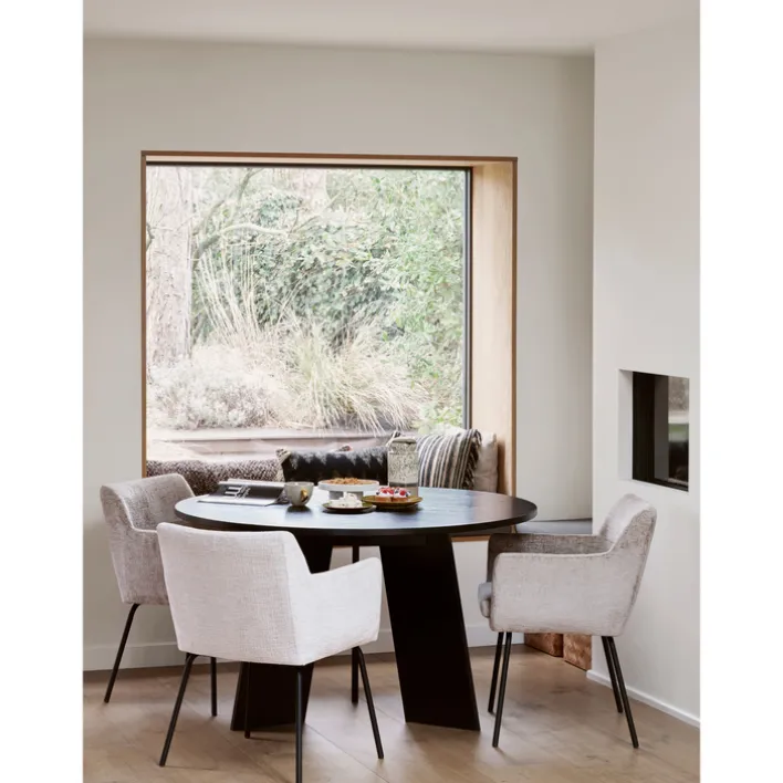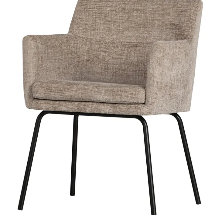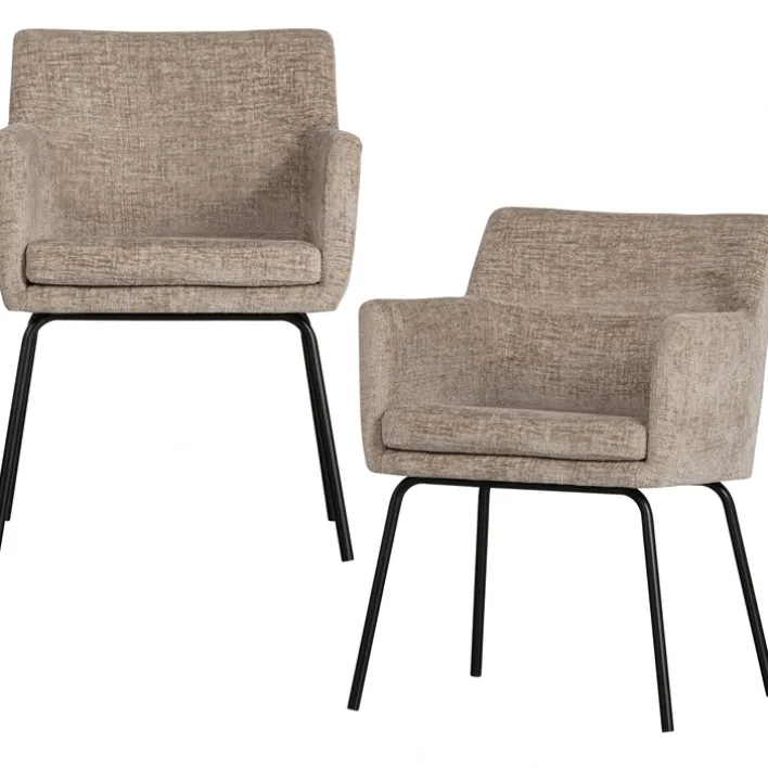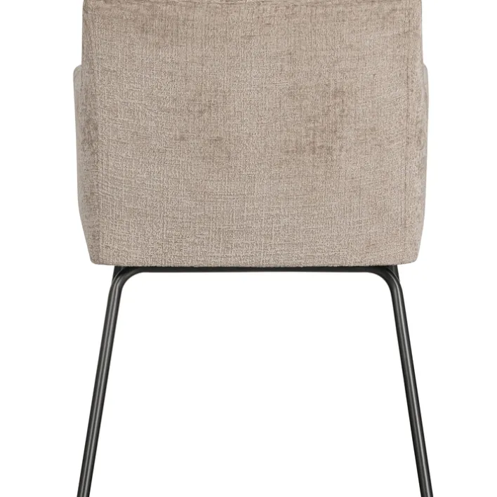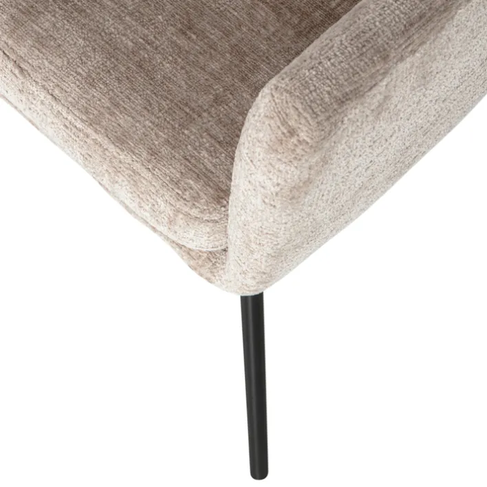 Der Stuhl KAM besitzt zwei bequeme Armlehnen. Er kommt als 2er-Set. Zu dem sandfarbigen Samtbezug passt das schwarze Vierfußgestell aus massivem, schwarzem Holz. Zudem ist jeder Stuhl kräftig gepolstert. Er darf mit maximal 150 kg belastet werden.