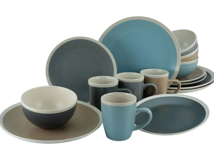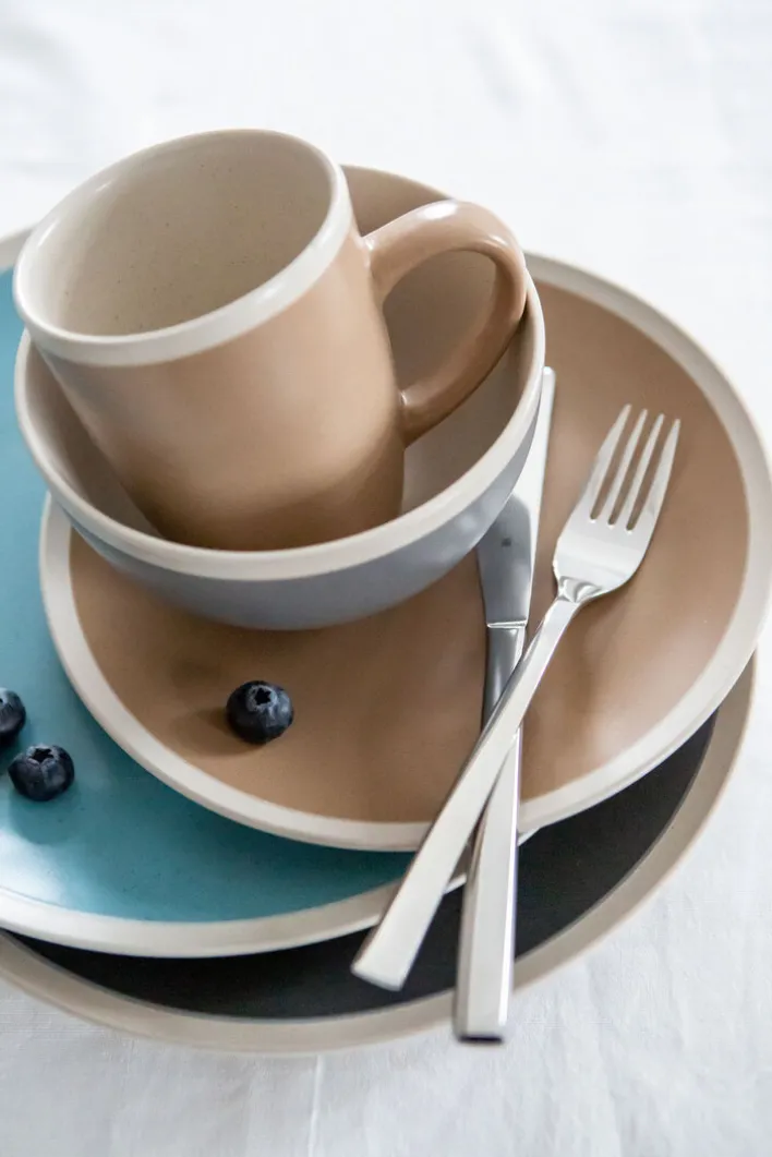 Das TAFELWERT Kombiservice JONE besteht aus vier flachen Tellern mit 27 cm Durchmesser, vier Desserttellern mit einem Durchmesser von 21 cm, vier Schalen mit 15 cm Durchmesser und vier Kaffeebechern mit einem Fassungsvermögen von 300 ml. Hergestellt aus hochwertigem Steinzeug sind die Geschirrteile robust, strapazierfähig und mikrowellengeeignet. Zudem lässt sich das Kombiservice bedenkenlos in der Spülmaschine reinigen. Durch die unterschiedlichen Farben – von Taupe bis Hellblau – ist das Geschirr auch optisch ein Highlight und sorgt für ein modernes Ambiente.