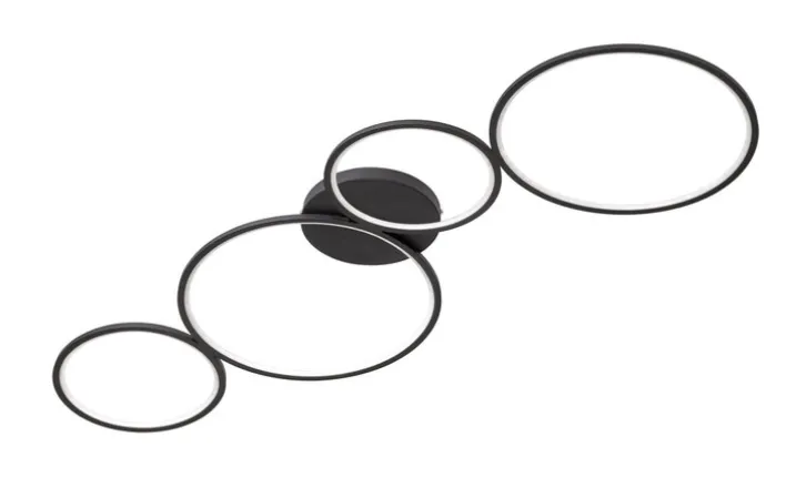 Die ungewöhnliche Formgebung macht diese Deckenlampe zu einem gelungenen Blickfang. Sie setzt sich nämlich aus vier Kreisen zusammen, die hintereinander aufgereiht sind. Genauso, wie die Basis der Lampe bestehen auch sie aus hochwertigem Metall und zeigen sich mit einer matten Oberfläche. Die Lampe wird mit einem passenden LED-Leuchtmittel geliefert. Das ist extrem energiesparend und bringt eine Lichtleistung von 3300 lm mit sich. Die Farbtemperatur liegt bei 3000 K. Außerdem bietet die LED eine Brenndauer von ungefähr 30.000 Stunden.