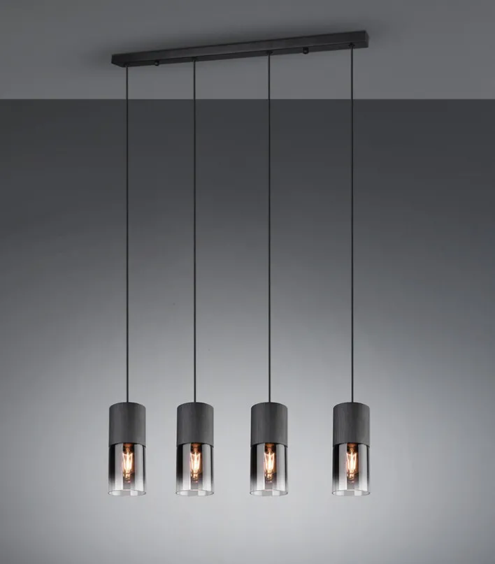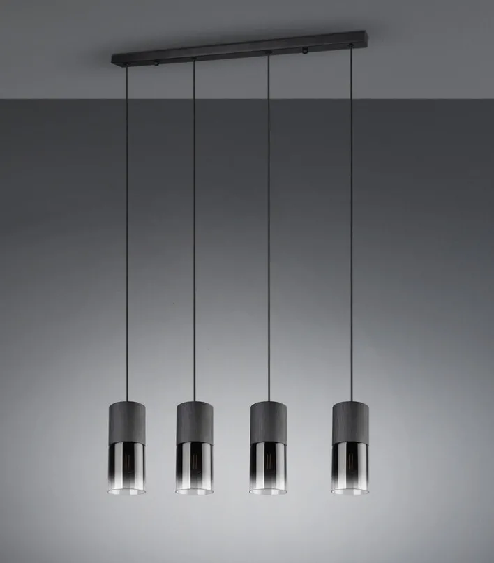 Mit der stilvoll anmutenden Kombination aus schwarzem Metall und rauchfarbigem Glas präsentiert sich die etwa 80.5 cm x 10 cm x 150 cm große LED Pendellampe ROBIN als modernes Wohnaccessoire aus dem Hause TRIO.