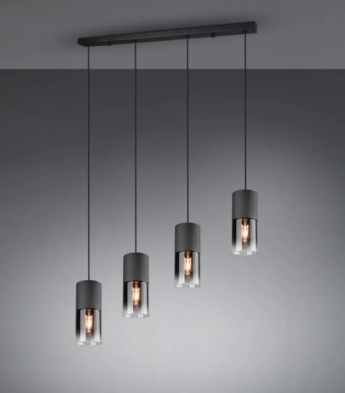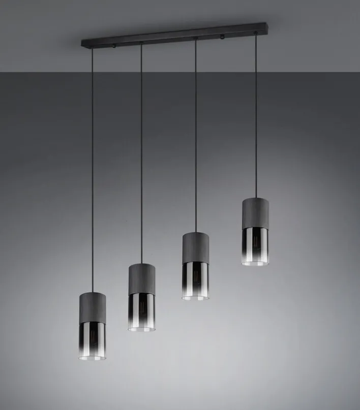 Eine Besonderheit des stilvoll anmutenden Designs der qualitativ hochwertigen ROBIN Pendelleuchte ist ihre asymmetrische Form. Die vier integrierten Leuchten, die Sie selbst wechseln können, hängen von unterschiedlich langen Stegen gerade nach unten. So ergibt sich eine raffinierte optische Diagonale, die eine reizvoll dynamische Ausstrahlung kreiert. Minimalistische Formen und die faszinierende Optik von Rauchglas komplettieren den ansprechenden Look und machen die edle Lampe von TRIO zum attraktiven Blickfang. Installieren Sie die sorgfältig verarbeitete LED Pendelleuchte über dem Ess-, Couch- oder Küchentisch.