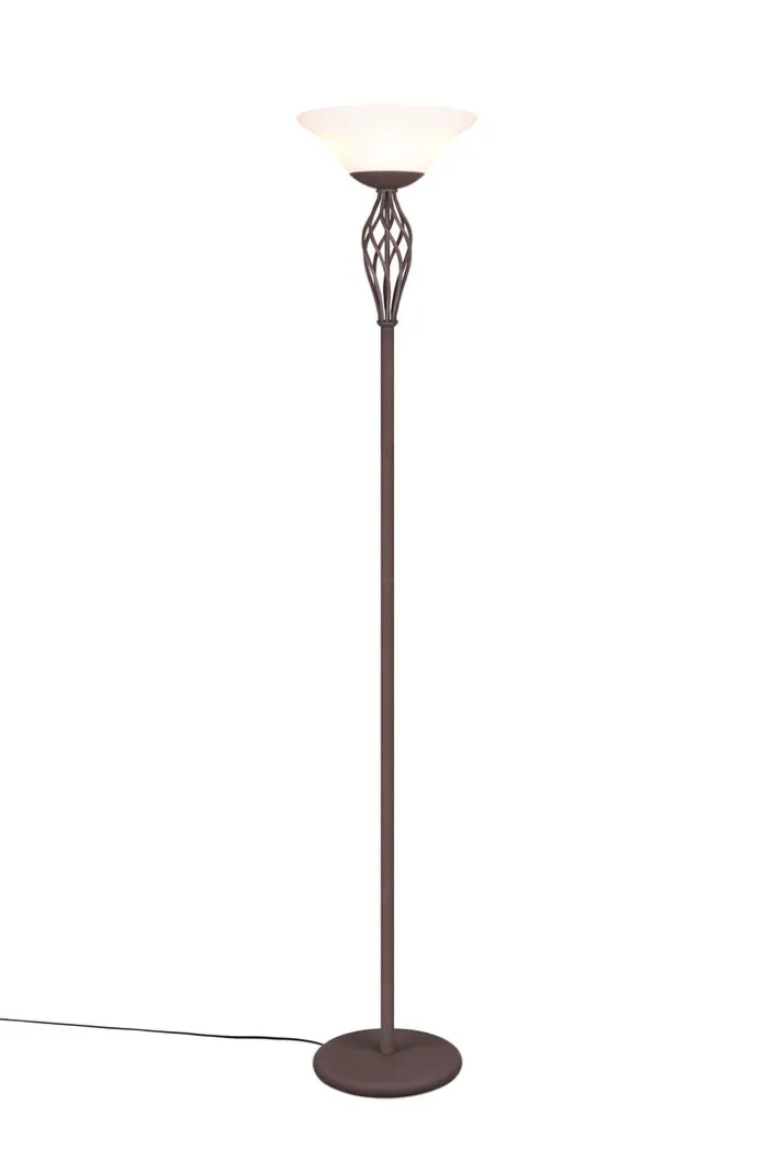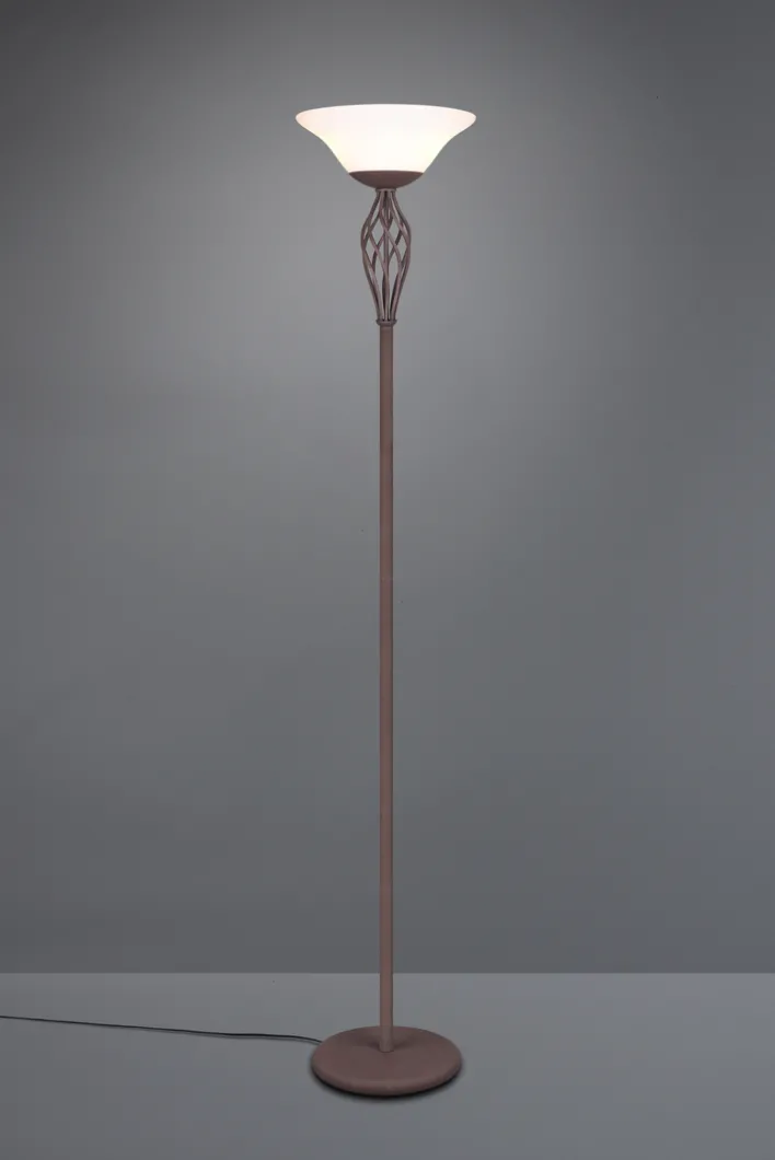 Der Deckenfluter aus der Serie RUSTICA von Trio vereint Funktionalität und ansprechendes Design im Landhausstil. Mit einer Höhe von 180 cm und einem Durchmesser von 33,5 cm fügt sich die Lampe harmonisch in verschiedene Wohnräume ein. Die Hauptfarbe ist ein elegantes Rostbraun, das durch weiße Glaselemente ergänzt wird. Der runde Tellerfuß sorgt für Stabilität und unterstreicht das klassische Design.
