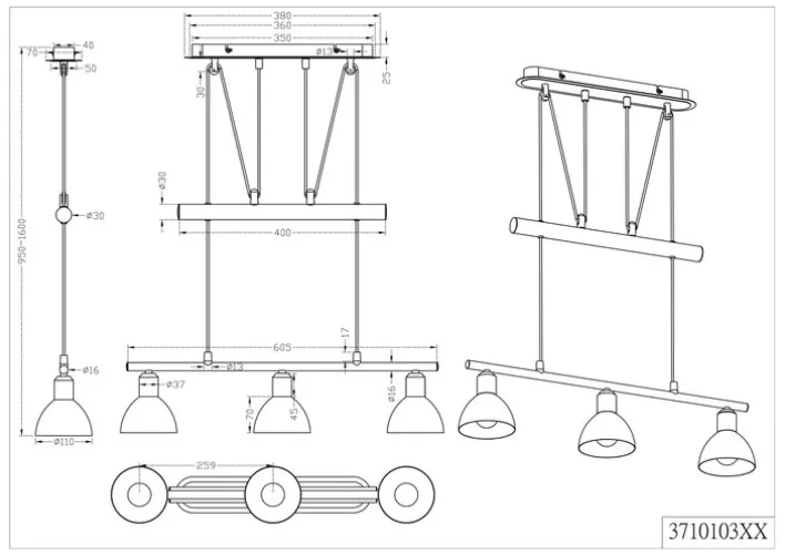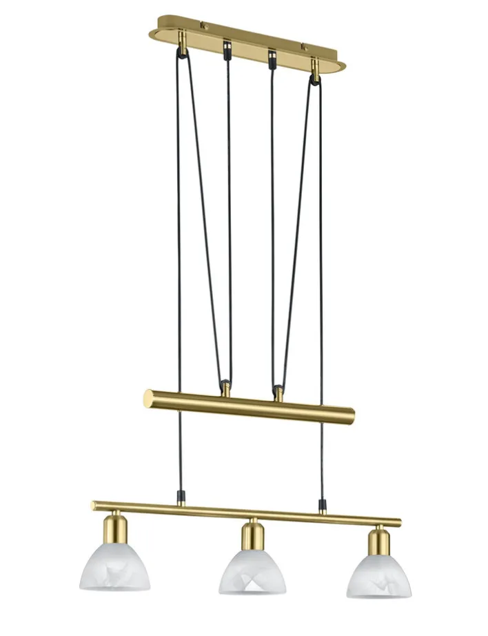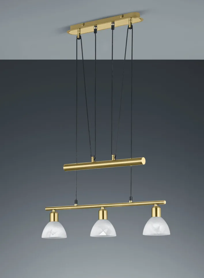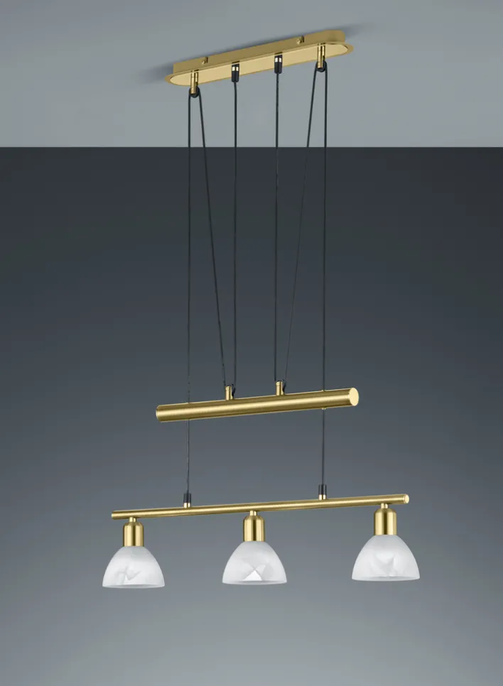 Die TRIO Retrofit LED Pendellampe LEVISTO besteht aus einem messingfarbigem Sockel und zwei Pendeln in Messing. Am unteren Pendel sind drei Lampenschirme aus weißem Glas befestigt. Die für den Betrieb benötigten 5 Watt LED Lampen mit E14 Fassung kommen gemeinsam mit der Pendellampe ins Haus, können aber getauscht werden. Mit einer durchschnittlichen Lebensdauer von 25000 Stunden und insgesamt 1410 Lumen sorgen die warmweißen LEDs für eine langanhaltend optimale Ausleuchtung. Zudem lässt sich die Leuchte stufenlos in der Höhe verstellen.