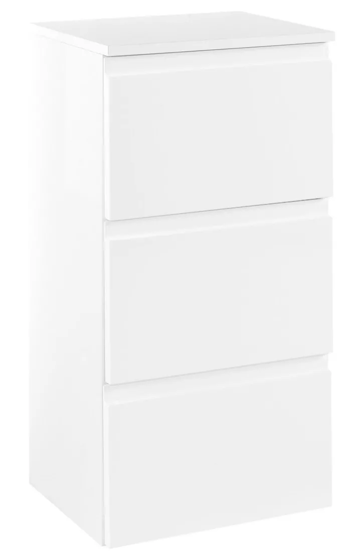 Mit seiner weißen Hochglanz-Oberfläche sieht der Unterschrank CARDIFF charmant aus. Er misst 40 x 79 cm und ist auch in Graphit erhältlich. Die Schubkästen schließen dank Soft-Close ganz leise.