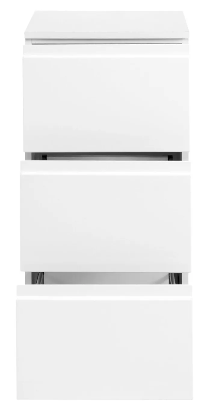 Der Unterschrank CARDIFF wertet das Badezimmer auf: In dem zusätzlichen Stauraum lassen sich Handtücher, Pflegeprodukte oder Accessoires unterbringen. Er passt auch in ein Schlaf- oder Jugendzimmer hinein. Mit den drei Schubkästen und seiner Tiefe von 35 cm stellt der Schrank wertvollen Aufbewahrungsplatz zur Verfügung. Da die Kästen ohne Griffe auskommen, ist der Reinigungsaufwand gering. Der Korpus besteht aus einer Holznachbildung, er kommt also auch mit leicht feuchten Bedingungen im Bad zurecht.