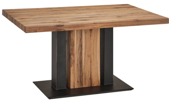 Der Esstisch aus der Serie POPPI zeichnet sich durch eine klare, rechteckige Form und eine massive Tischplatte aus Eiche aus. Die Oberfläche zeigt eine natürliche Maserung in unterschiedlichen Brauntönen, die dem Tisch eine ausdrucksstarke und authentische Optik verleiht. Die Kombination aus Holz und den schwarzen Metallelementen am Gestell sorgt für einen modernen Kontrast und unterstreicht das zeitgemäße Design. Das Gestell besteht aus einem zentralen Fuß, der sowohl aus massivem Eichenholz als auch aus Eisen gefertigt ist und auf einer rechteckigen Metallbodenplatte ruht.