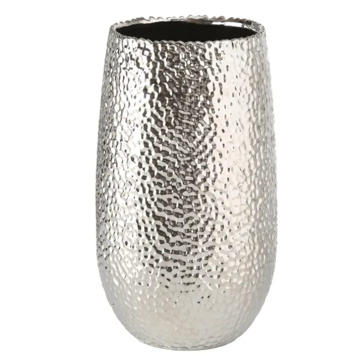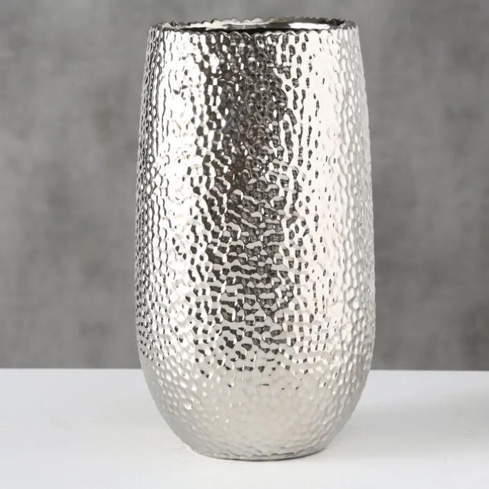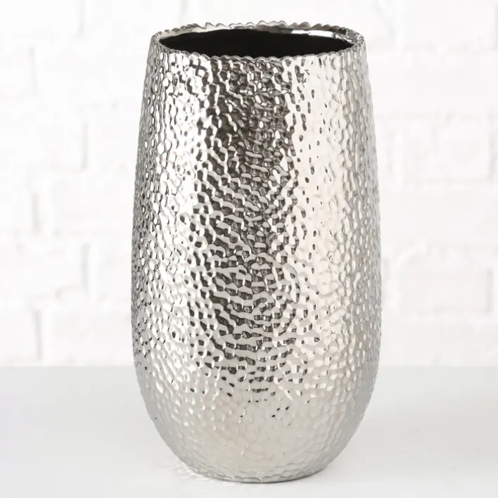 Womit die Vase sofort neugierige Blicke erntet, ist ihre ungewöhnlich strukturierte Oberfläche. Wird sie beleuchtet, entsteht eine besonders ansprechende Optik. Zugleich ist die Vase dank ihrer Silberfarbe optisch nicht zu dominant, sodass die Blumenpracht wunderbar zur Geltung kommen kann. Ob auf dem Esstisch, auf einer Kommode oder im Regal: Die Keramikvase fügt sich überall problemlos ein und verleiht dem Zuhause neuen Glanz. Wer eine einheitliche Optik mag, kann natürlich gerne mehrere der schönen Vasen kombinieren.