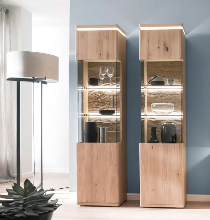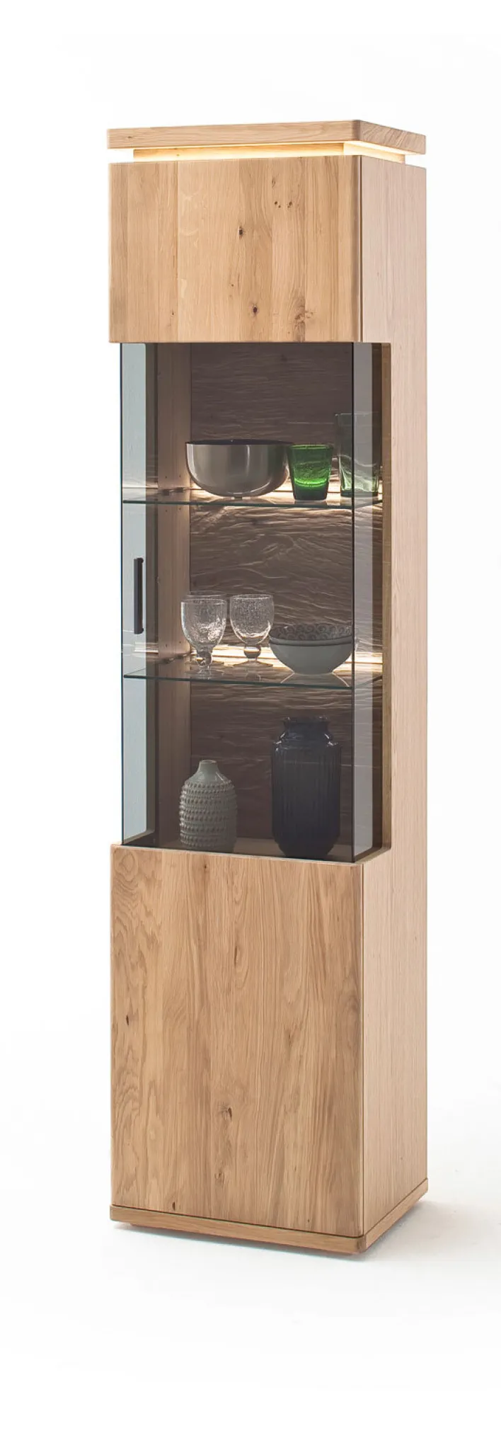 Die natürliche Holzmaserung von Balkeneiche bianco trifft in der Vitrine BARCELONA R auf eine geradlinige Formsprache.