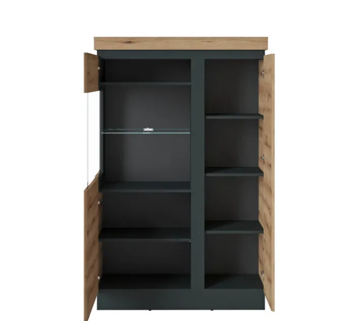 Die stylische Vitrine CORTE mit den Maßen 104 x 164 cm kombiniert den grauen Korpus mit Fronten in eleganter Coaste Evolke Eiche zu einem top modernen Vitrinenschrank. Hinter den zwei großen Drehtüren, von denen eine mit einem 4 mm starken Glaseinsatz ausgestattet ist, bietet die trendige Vitrine sieben Einlegeböden auf denen sich Alltagsgegenstände und geliebte Schmuckstücke unterbringen lassen. Die Türen sind mit einer Soft-Close Funktion ausgestattet und erlauben ein praktisch lautloses Schließen.