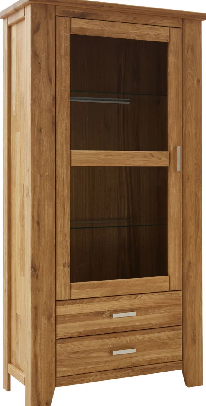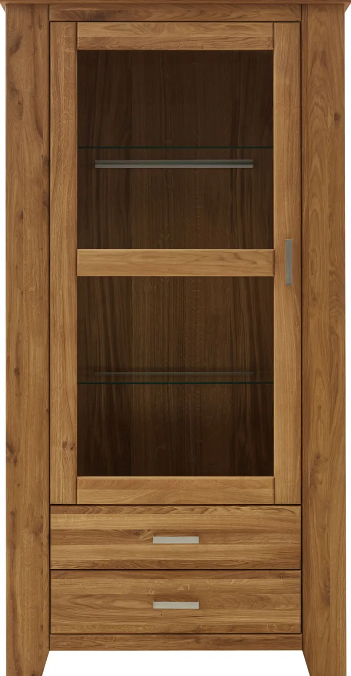 Die Vitrine LOFT I besteht aus geöltem Eiche Massivholz. Sie zaubert mit warmem Braunton und intensiver Maserung rustikales Flair in den Wohnraum und verleiht Gemütlichkeit. Zudem bescheren ihr die geölten Oberflächen eine verbesserte Strapazierfähigkeit. Die Vitrine ist mit zwei Schubkästen und einem geräumigen Vitrinenteil mit Glastür ausgestattet. Hinter der Glastür lässt sich die Lieblingsdekoration staubgeschützt aufbewahren, während die Schubkästen Platz für Zeitschriften und vieles mehr bieten. Für ein harmonisches Ambiente empfiehlt es sich, die Vitrine mit weiteren LOFT-Möbeln zu kombinieren.