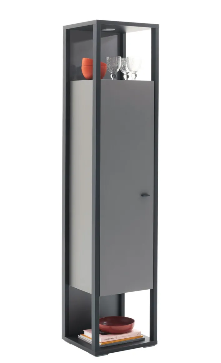 Die 1-türige Vitrine LUXOR hat die Maße 40 x 178 cm und ist zeitlose elegant. Dank der schlanken Form ist der Schrank in den Farben Royal grau/ anthrazit ideal für kleinere Räume. Die Vitrine passt in modern eingerichtete Wohnzimmer und ist mit zwei offenen Fächern zum Zeigen schöner Objekte ausgestattet. Das Schrankteil mit drei Einlegeböden bietet zusätzlichen Stauraum. Die schöne Vitrine setzt einen Akzent und schafft eine wohnliche Atmosphäre.