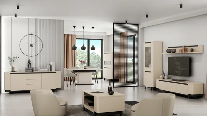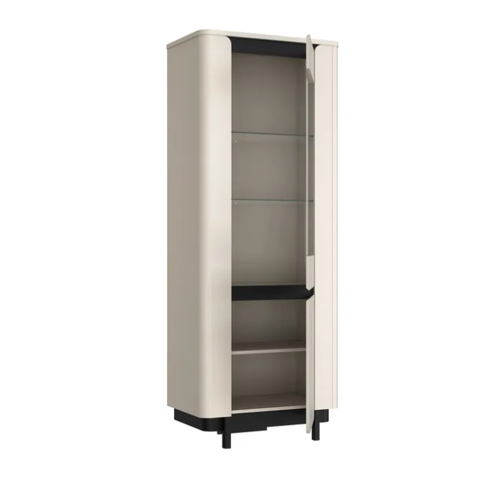 Die Vitrine VODOL mit den Maßen 75,6 x 196,3 cm setzt in ihrem eleganten Cremeton und den schwarzen Applikationen stilvolle Akzente in jedem Wohnraum. Die Glastür im oberen Drittel besteht aus hochwertigem Sicherheitsglas, hinter der sich zwei beleuchtete Glaseinlegeböden befinden. Der untere Bereich wird durch eine Drehtür verschlossen und bietet mit einem integrierten Einlegeboden zusätzlichen Stauraum.