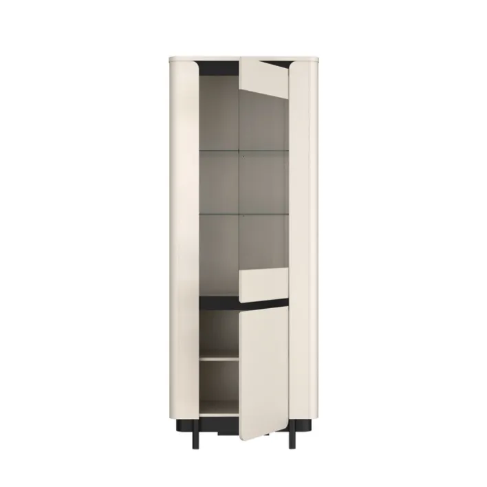 Fronten und Korpus sind aus Spanplatten in cremefarbener Holznachbildung gefertigt. Der Sockelbereich sowie die Füße sind in schwarz gehalten, ebenso der obere Abschluss der Vitrine wie auch eine optische Teilung zwischen Glas- und Drehtür. Dank der Soft-Close-Funktion schließen die Türen sanft und leise.