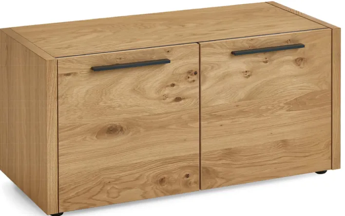 Die Garderobenbank LEVIO besteht aus Metall und furniertem Holz. Verwendet wurde robuste Eiche. Die begeistert nicht nur mit einer hohen Stabilität, sondern auch mit einer warmen Farbgebung und einer sehr natürlichen Maserung. Die Front der Garderobenbank unterteilt sich in zwei Drehtüren. Dahinter befindet sich ein Holzeinlegeboden, der optional verstellbar ist. So können Sie in der Bank Ihre Schuhe unterbringen. Außerdem können Sie sich beim Anziehen der Schuhe einfach auf die Bank setzen. Dank ihres natürlichen und dennoch sehr geradlinigen Designs passt die Garderobenbank LEVIO in zahlreiche Wohnkonzepte.
