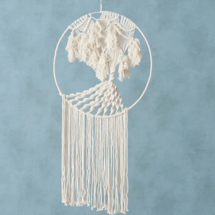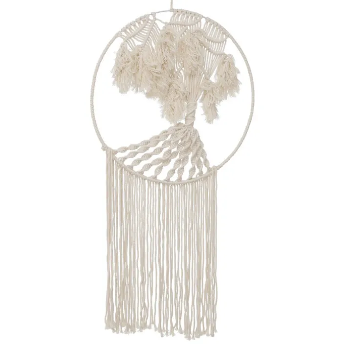 Für die kunstvolle Wanddeko TANIYA werden Schnüre in einer aus dem Orient stammenden Knüpftechnik sorgsam miteinander verknotet, sodass das Abbild eines kraftvollen Baumes entsteht. Die Wurzeln des Baumes gehen in Fransen über. An dem in die Wanddeko eingearbeiteten Aufhänger kann sie sofort aufgehängt werden.