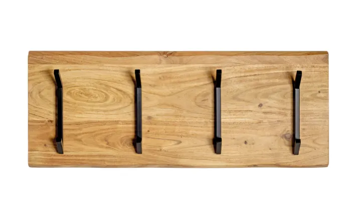 An den vier robusten Garderobenhaken können jeweils zwei verschiedene Kleidungsstücke aufgehängt werden. Die Form der Haken überzeugt sowohl am oberen als auch am unteren Ende mit einem kleinen Winkel. Diese Garderobenhaken sind lackiert und daher genauso leicht zu pflegen wie das Holzbrett. Insgesamt hat die Garderobe ein Gewicht von 8,19 Kilogramm. Das Modell ist eine gute Ergänzung in jedem Garderobenbereich.