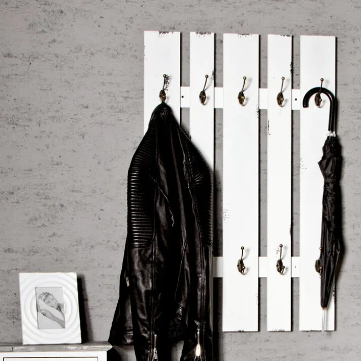 Die Wandgarderobe ist mit zehn schwarzen Haken aus robustem Metall ausgestattet. Daran können Sie Jacken, Mäntel, Schals und andere Dinge aufhängen. Die Haken sind an einer Basis aus einer palettenartigen Konstruktion aus MDF befestigt. Diese ist in Weiß gestrichen und begeistert mit einem coolen Used-Look. Da Sie die Garderobe an der Wand befestigen können, verbraucht sie keine Bodenfläche, sodass sie auch für kleine Flure perfekt geeignet ist. Außerdem erschlägt sie den Raum aufgrund ihrer hellen Farbe nicht, sondern trägt zu einer freundlichen Atmosphäre bei.