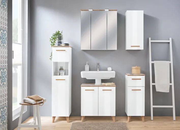 Dieser Wandschrank ist aus einer hochwertigen und robusten Holznachbildung gefertigt. Die glänzende Oberfläche setzt exklusive Akzente und steht für einen besonderen Schick. Eindrucksvoll ist der tolle Farbkontrast. So hebt sich der Griff in Braun hervorragend von der weißen Grundfläche ab. Dieser Wandschrank ist mit einer praktischen Drehtür ausgestattet, hinter welcher sich zwei Einlegeböden befinden. Somit bietet der Schrank trotz der kompakten Maße von 30 x 70 x 20 cm viel Stauraum für die verschiedensten Badezimmerutensilien. Dieser Wandschrank bietet sich als hervorragende Ergänzung neben einem Spiegel oder einem Spiegelschrank oberhalb des Waschbeckens an. Dank der gradlinigen Optik eignet sich das Möbel für die unterschiedlichsten Badezimmerstile. Passende Ergänzungsmöbel wie einen Waschbeckenunterschrank, einen Spiegelschrank oder einen Midischrank finden Sie in Ihrem porta! Online Shop.