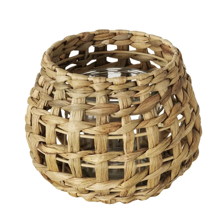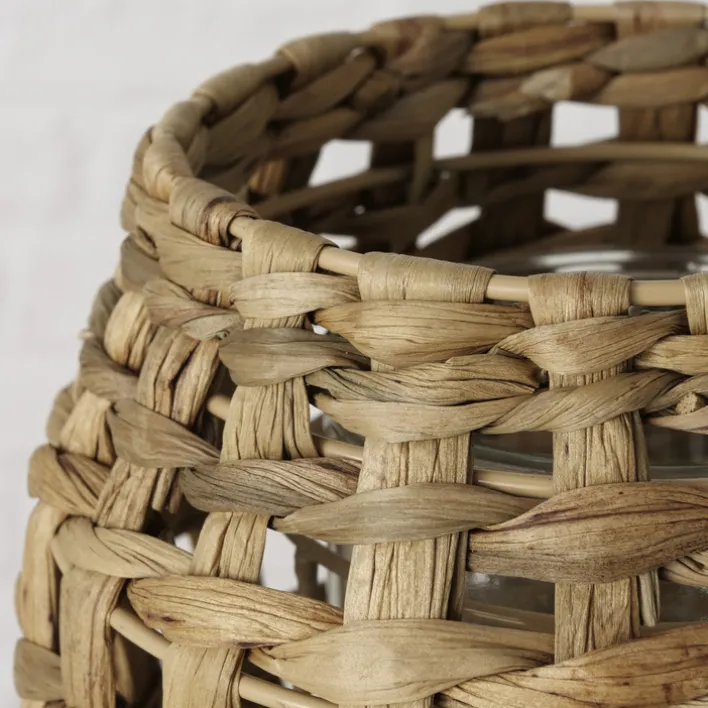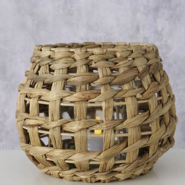 Das Geflecht aus Naturmaterialien sorgt für eine ansprechende Optik und verleiht jedem Raum eine natürliche Note. Das Windlicht wird ohne Kerzen geliefert, sodass es individuell nach den eigenen Vorlieben gestaltet werden kann. Es eignet sich ideal als dekoratives Element für Wohnräume oder als stimmungsvolle Beleuchtung auf dem Balkon oder der Terrasse.