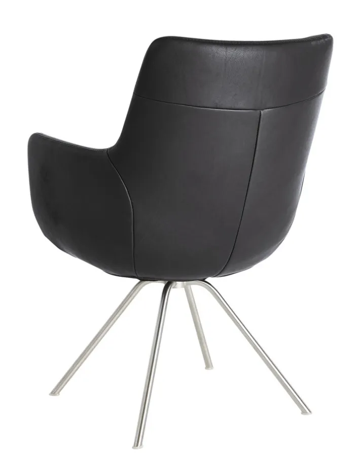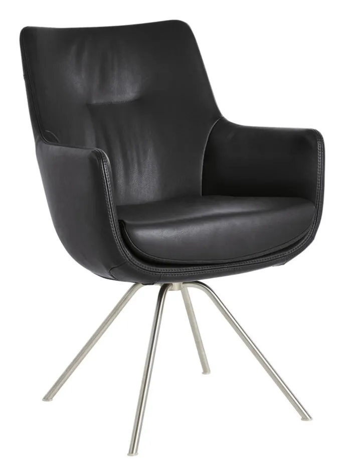 Der WK-WOHNEN Armlehnstuhl mit den Maßen 60 x 90 x 61 cm kombiniert ein silberfarbiges Vierfußgestell aus Edelstahl mit einem schwarzen Leder-Sitz mit komfortablem Sitzkissen. Er bietet eine angenehme Sitztiefe von 46 cm und ist 51,5 cm hoch. Dank fester Armlehnen und drehbarem Sitz ist das Aufstehen vom Tisch ganz einfach – und das ganz ohne Sesselrücken. Neben der hohen Qualität und dem hohen Sitzkomfort überzeugt der Armlehnstuhl mit einem stylischen Look. Er harmoniert mit klassischen und eleganten Einrichtungsstilen und ist somit vielseitig einsetzbar.