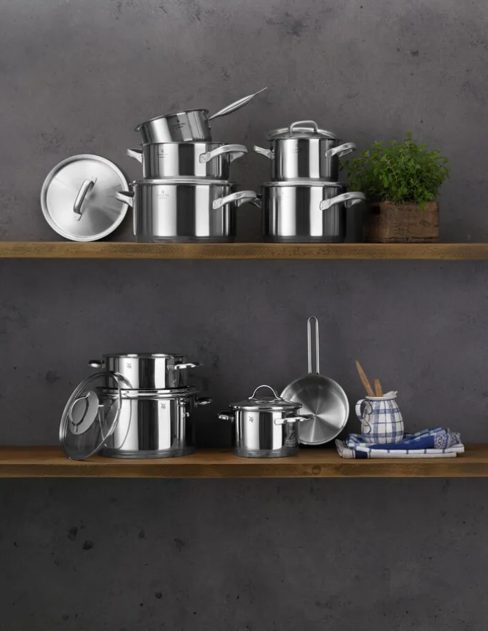 Wer gerne und regelmäßig kocht, braucht verschiedene Töpfe, wobei sich für die Standardausstattung ein paar Grundformen bewährt haben. Diese kombiniert WMF in unterschiedlichen Größen zu einer vielfältigen Auswahl, wobei Fleisch- oder Bratentöpfe in keinem Set fehlen dürfen. In den Fleischtopf passt alles rein, was zum Kochen viel Flüssigkeit braucht, da sein Rand besonders hoch ist, spritzt beim Braten von Fleisch nichts heraus und auch Nudeln, Kartoffeln und Gemüse nimmt er ohne Probleme auf. Der Bratentopf ist eine Kombination aus Pfanne und Fleischtopf, der Rand ist höher als bei der Pfanne, somit spritzt beim Braten kaum Fett heraus. Zugleich ist der Rand niedriger als beim Fleischtopf, damit die Flüssigkeit schneller verdampft und Sie das Fleisch/Gemüse problemlos wenden können. Gefertigt aus pflegeleichtem und robustem Cromargan®, sind alle Töpfe mit einem TransTherm® Allherdboden ausgestattet und so für alle Herdarten inklusive Induktion geeignet.