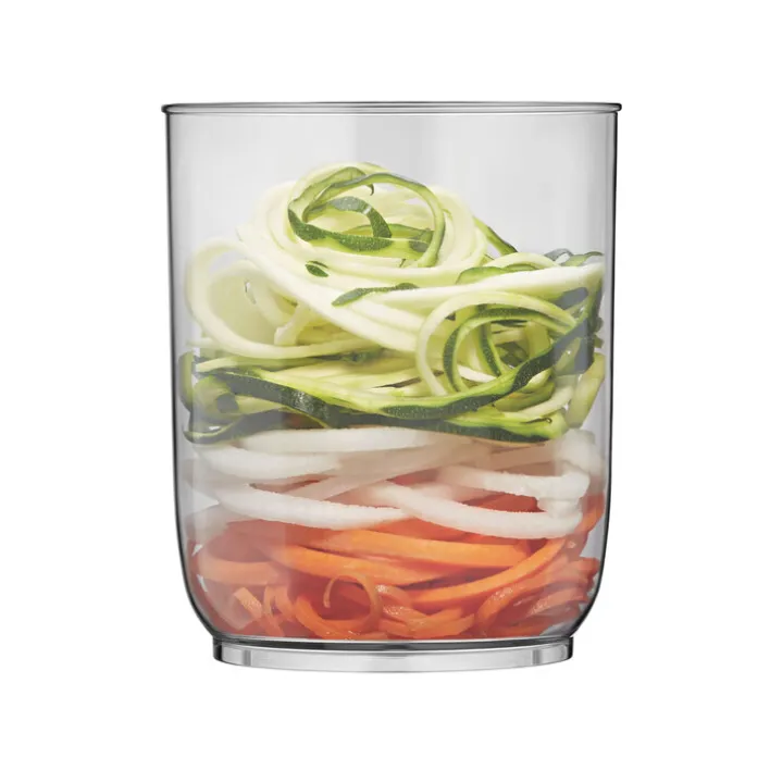 Das hochwertige Gehäuse des Spiralschneiders sowie die Schneideeinsätze mit Perfect Cut Technologie sind aus Edelstahl gefertigt. Das rostfreie Metall ist pflegeleicht. Der Einfüll- und der Auffangbehälter bestehen aus transparentem Kunststoff. Alle abnehmbaren Teile des Spiralschneiders sind für die Reinigung in der Spülmaschine geeignet.