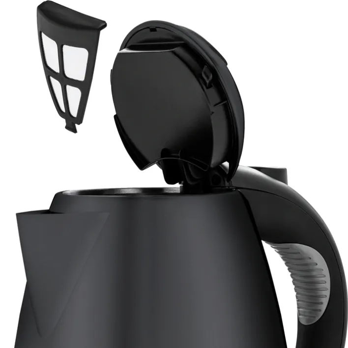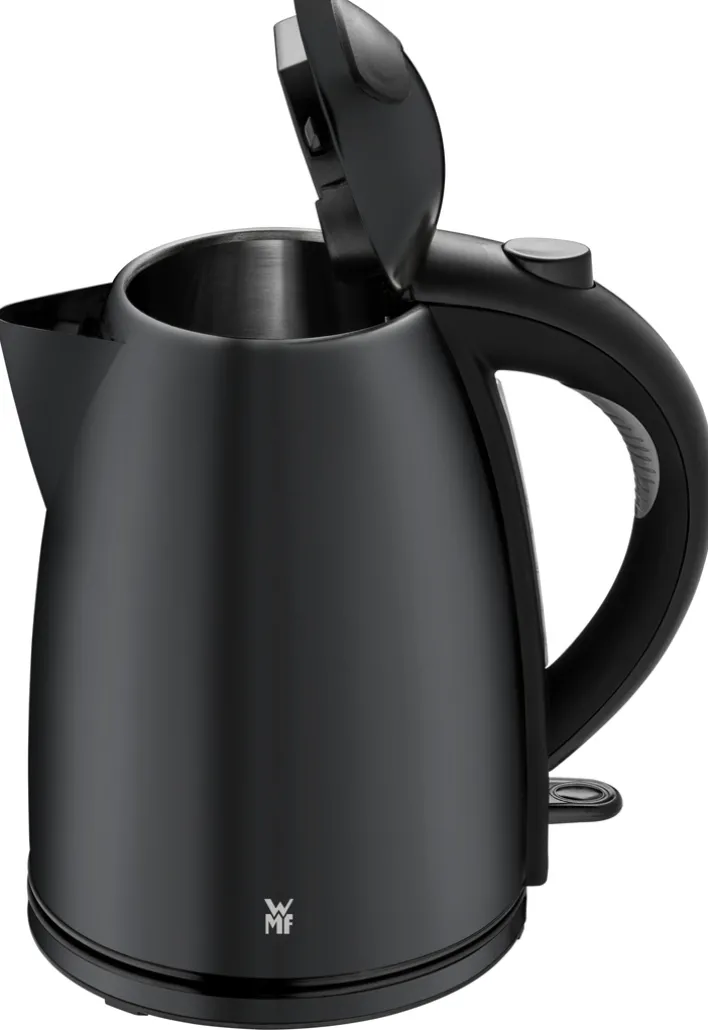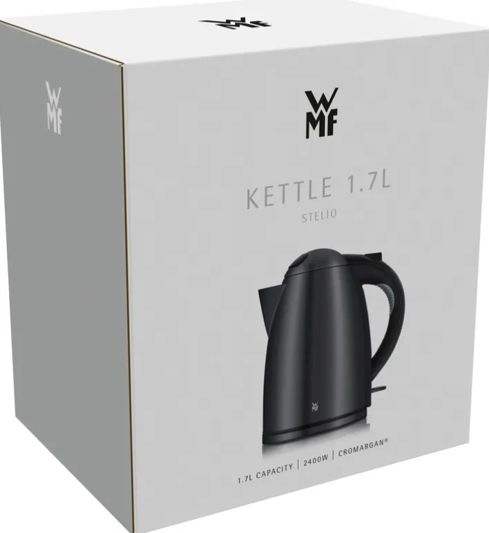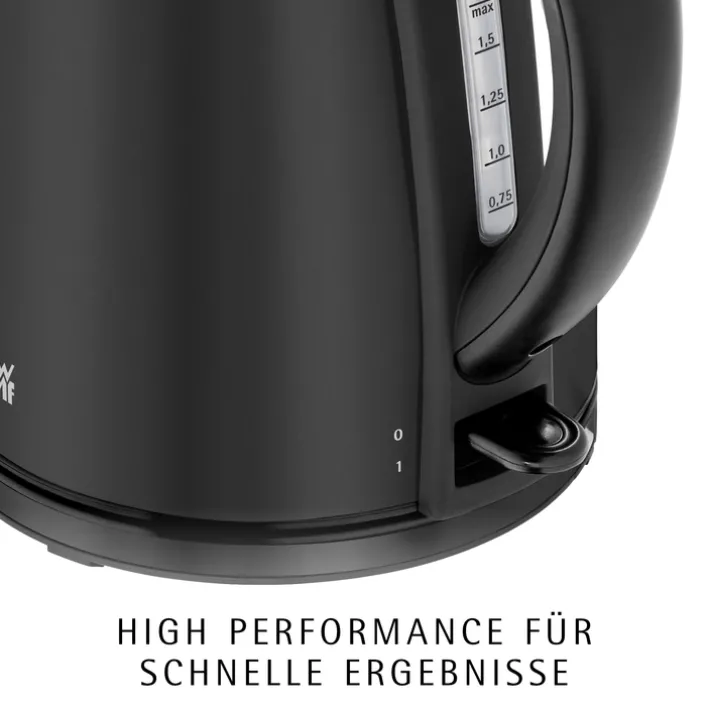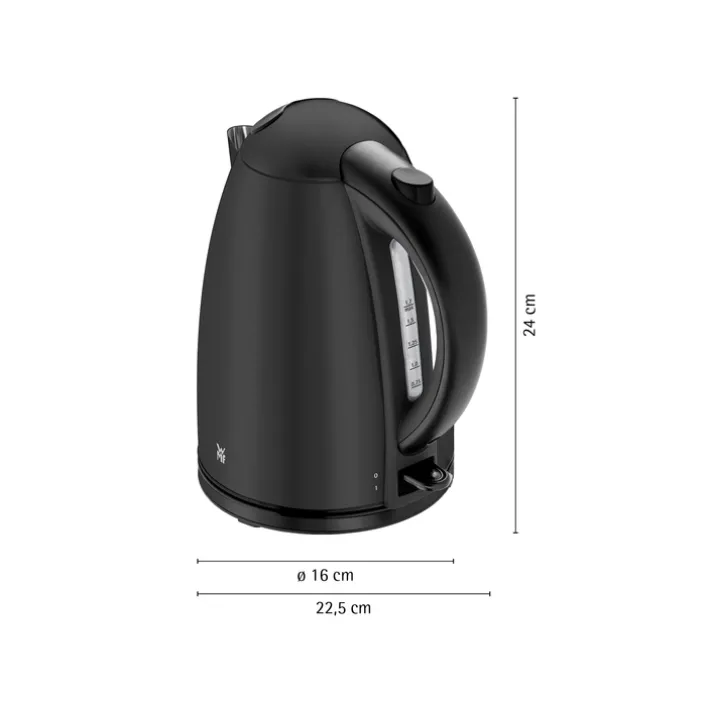 Der Wasserkocher STELIO BLACK von WMF überzeugt durch seine schlichte, moderne Gestaltung in tiefem Schwarz. Das Gehäuse besteht aus Metall mit glatter, matter Oberfläche, was dem Gerät ein zeitgemäßes und gleichzeitig zurückhaltendes Erscheinungsbild verleiht. Die kompakten Maße von 17 cm Länge, 22 cm Breite und 24,5 cm Höhe ermöglichen eine platzsparende Unterbringung in der Küche.
